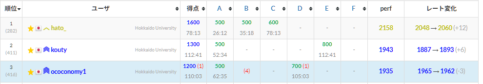 また、北海道大学の ICPC チームとして、レーティングや Championship 進出欲が近い Akai_koibito というチームもいるのだが、そのチームのメンバーとも海外 Regional について色々話していて、恐らく向こうのチーム内でも我々と同じような話が行われ、結果的に北大からは2チームが Taichung Regional に行くことに。ちなみに北大から海外 Regional に行くというのは相当久々らしい?(少なくともここ5年はないはず)